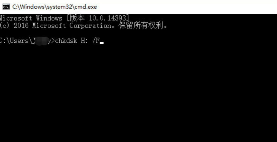2、然后輸入“chkdsk H: /F”,其中“H:”是U盤盤符,輸入后點擊鍵盤回車鍵(用于檢查文件系統(tǒng)情況),提示沒問題的話直接重新拔插U盤即可。
