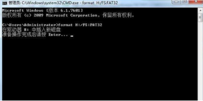 2.按下回車鍵后會彈出命令提示符窗口,此時我們需輸入命令“ format H:/fs:fat32 ”u盤的盤符是H因此format后面就為H,若是其他的盤符,我們將H修改即可。