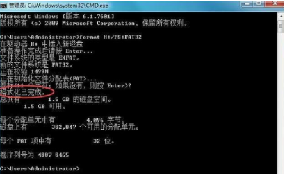 按下回車鍵后會彈出命令提示符窗口,此時我們需輸入命令“ format H:/fs:fat32 ”u盤的盤符是H因此format后面就為H,若是其他的盤符,我們將H修改即可。輸入完成后,我們按下回車鍵,即可進入到格式化的操作當(dāng)中。最后格式化完成,系統(tǒng)會發(fā)出格式化完成的提示。這就是u盤無法完成格式化的步驟內(nèi)容,希望能給大家提供幫助。
