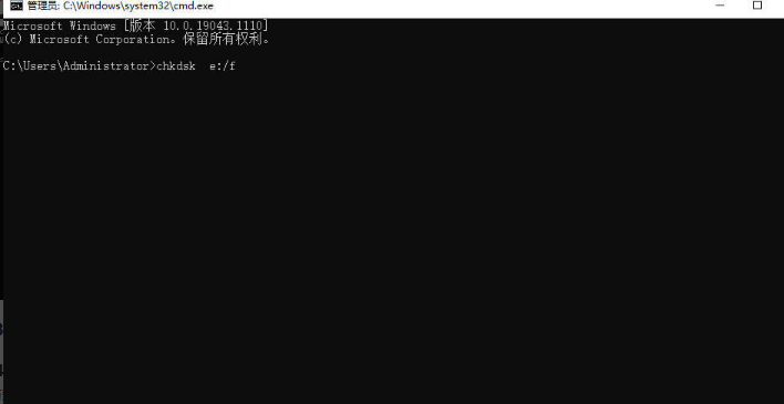 2. 進入管理員頁面后,選擇執(zhí)行chkdsk命令,chkdsk e: /f 中的e為U盤的磁盤區(qū)符號,f就是修復(fù)的命令名稱。