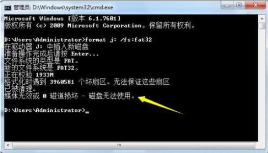 2、接著輸入“format j: /fs:fat32”(其中j代表U盤(pán)所在盤(pán)符)并按回車(chē)鍵執(zhí)行U盤(pán)格式化操作;如圖所示:
