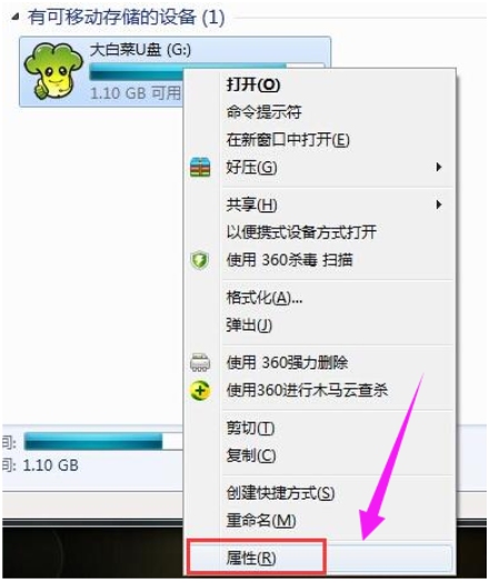 4、以上的解決方法沒有解決問題的用戶,可以繼續(xù)設(shè)置以下的步驟。進(jìn)入“計(jì)算機(jī)”找到移動(dòng)磁盤盤符,右鍵選擇屬性。