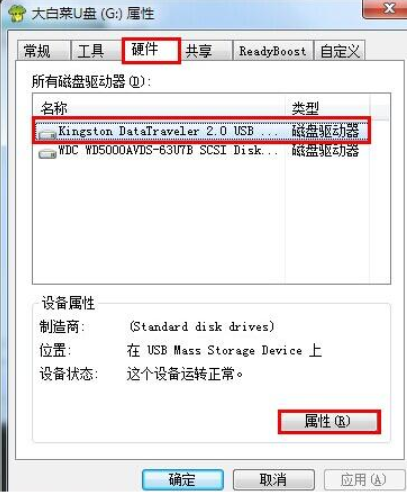 5、在打開的屬性窗口,切換到硬件項(xiàng),點(diǎn)擊打開屬性(R)。
