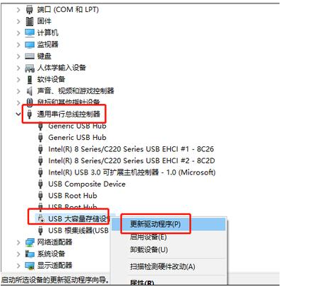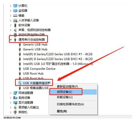 2、進(jìn)入設(shè)備管理器頁面后,右鍵【USB大容量存儲(chǔ)設(shè)備】,選擇【啟用設(shè)備】。