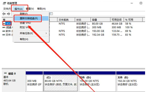 2、從C盤開始,逐一選中,點(diǎn)擊工具欄的【操作(A)】,選擇【重新掃描磁盤(R)】進(jìn)行修復(fù)即可。