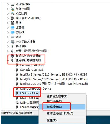 2、在設(shè)備管理器頁面,點(diǎn)擊展開【通用串行總線控制器】,右鍵【USB Root Hub】并選擇【卸載設(shè)備】或刪除,最后重啟電腦,系統(tǒng)會(huì)自動(dòng)重裝驅(qū)動(dòng)程序。