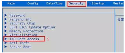 1、一般來說,重啟電腦不斷按下BIOS快捷鍵就可以進(jìn)入BIOS界面。進(jìn)入BIOS界面后,使用方向鍵切換至“Security”選項(xiàng)卡,選擇“I/O Port Access”并回車。