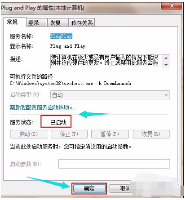 5.在服務(wù)狀態(tài)設(shè)置為“已啟動”,點擊“確定”保存。
