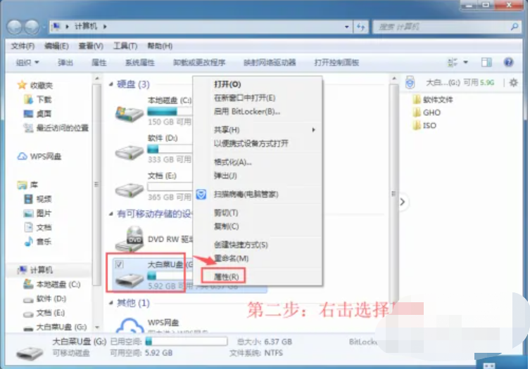 2、打開資源管理器(計(jì)算機(jī))以后右擊優(yōu)盤磁盤。然后點(diǎn)擊右擊菜單中的“屬性”。