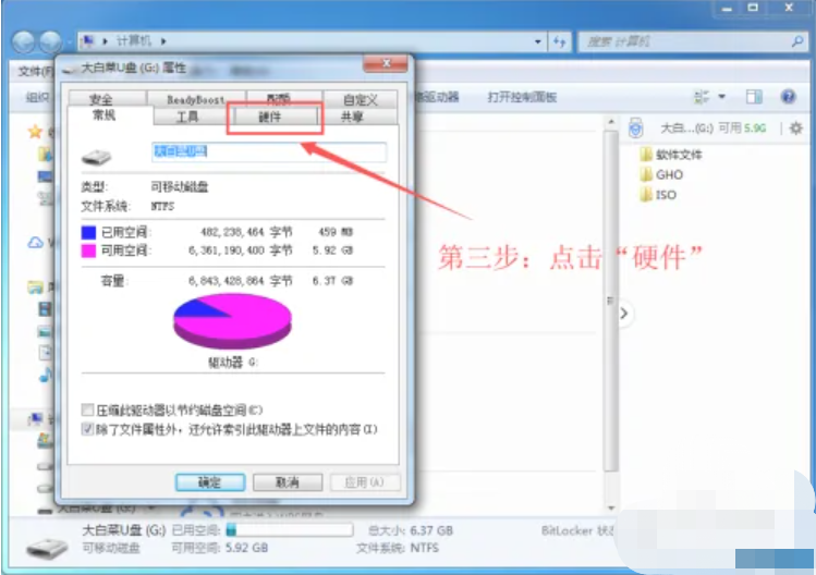 3、打開優(yōu)盤的“屬性”面板以后。電腦用戶點(diǎn)擊菜單欄中的“硬件”選項(xiàng)。