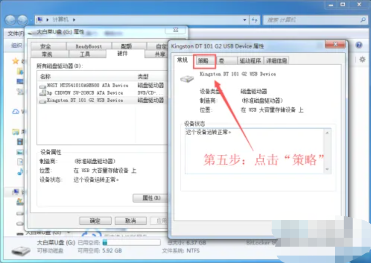 5、進(jìn)入優(yōu)盤的磁盤驅(qū)動(dòng)器操作面板后,點(diǎn)擊菜單欄中的“策略”選項(xiàng)。