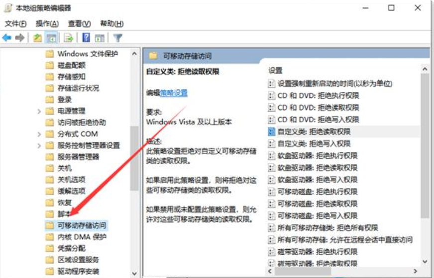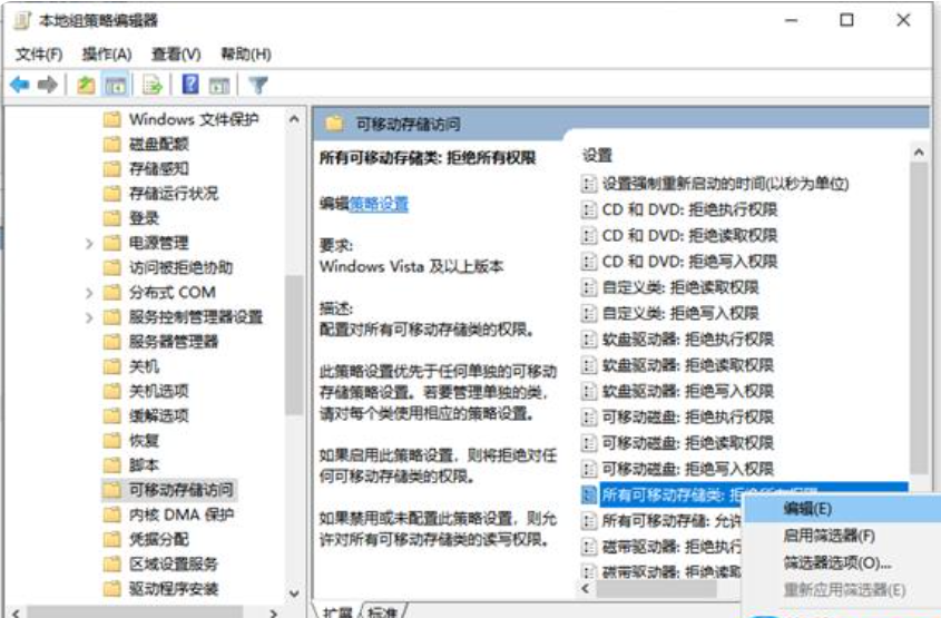 3、在右邊尋找全部可移動(dòng)儲(chǔ)存類:回絕全部管理權(quán)限,右鍵以后點(diǎn)一下編輯,進(jìn)入下一步。