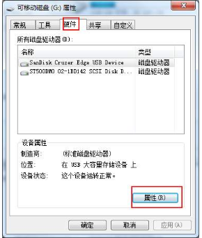 1. 打開電腦,右擊“我的電腦”,右擊u盤盤符,選擇“屬性”。在彈出的窗口中切換到“硬件”選項,選擇“屬性”。