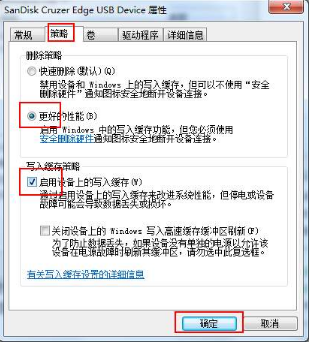2. 在彈出的窗口中選擇“策略”,點擊“更好的性能”,并勾選“啟用設備上的寫入緩存”選項。