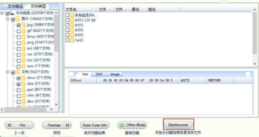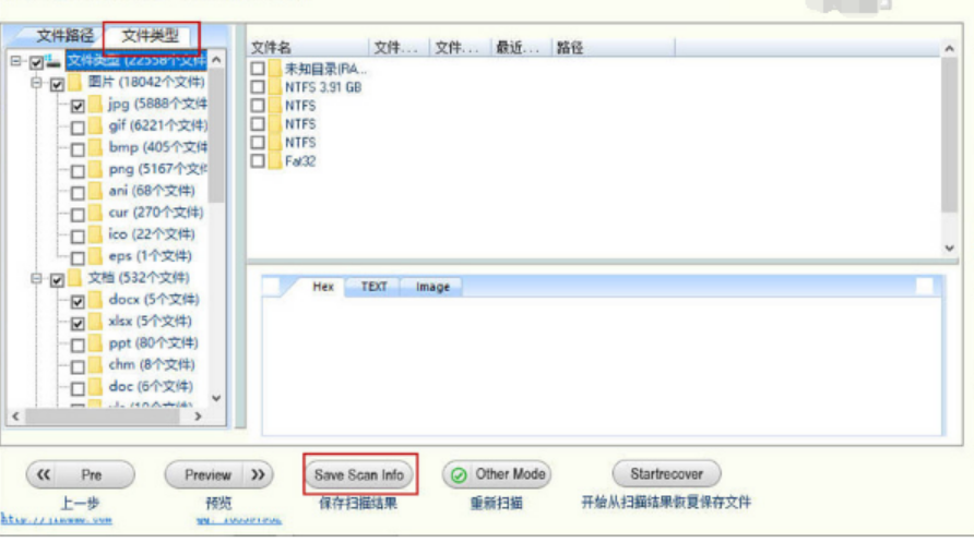 6、完成保存掃描信息后,點(diǎn)擊“文件類型”。選擇文件類型可以快速找回需要的數(shù)據(jù),節(jié)省更多時(shí)間。然后點(diǎn)擊“開始恢復(fù)”按鈕。