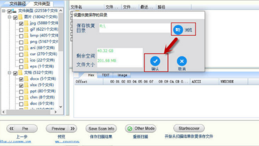 7、設(shè)置恢復(fù)保存數(shù)據(jù)地址,然后點(diǎn)擊“確認(rèn)”按鈕。保存位置一定不要設(shè)置在丟失文件同一個(gè)盤符中。