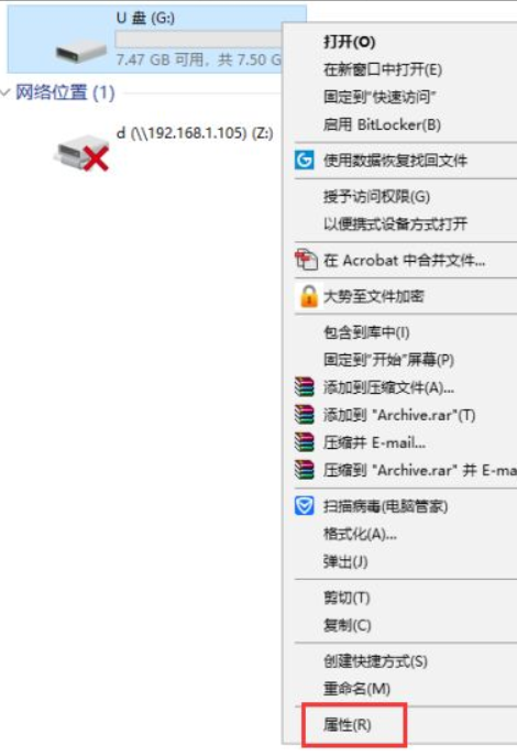 1.在U盤(pán)盤(pán)符上鼠標(biāo)右鍵“屬性”,選擇“硬件”選項(xiàng)卡。