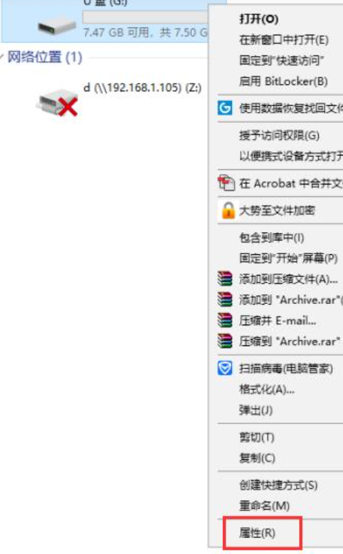 1、在U盤盤符的上方點擊右鍵,在彈出的菜單中點擊屬性。