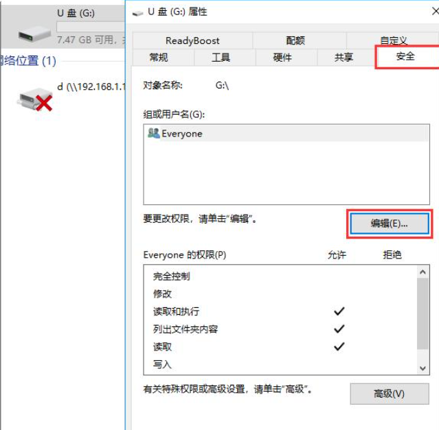 3、在打開的窗口上部選中everyone,然后在下方everyone的權(quán)限中勾選完全控制,最后依次點擊確定即可。然后我們就可以對U盤進(jìn)行格式化了。