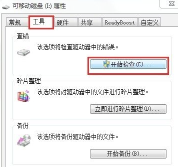 2、打開的窗口中切換至“工具”選項卡,點擊“查錯 開始檢查”按鈕,在彈出的窗口中同時勾選兩項,點擊“開始”按鈕來檢查并修復磁盤錯誤。