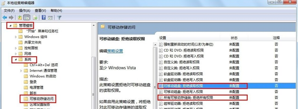 5、在組策略管事器窗口中,依次點擊“管理模塊”→“系統(tǒng)”→“可移動存儲訪問”,確保右側(cè)“可移動磁盤:拒絕讀取權限”和“所有可移動磁盤:拒絕讀取權限”兩項均被設置為“未配置”或“已禁用”。