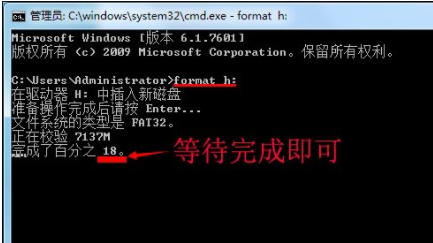 2、命令窗口中如圖輸入“format h:”(注意:這里的“h”是u盤插在當(dāng)前電腦中的盤符。),回車,等待格式化即可