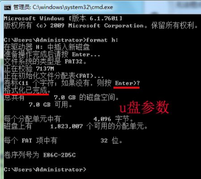 3、格式化完成,按回車查看u盤相關(guān)參數(shù)