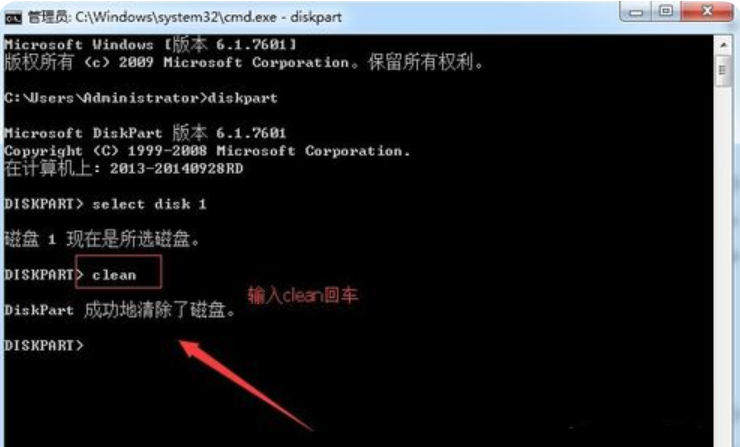 4、然后窗口中會(huì)提示我們選擇磁盤,選擇完成磁盤后繼續(xù)輸入命令clean刪除u盤的所有信息。(所以在此之前要將U盤的文件做好備份,如果忘記備份的話,數(shù)據(jù)丟失的話不要著急,繼續(xù)往下看)