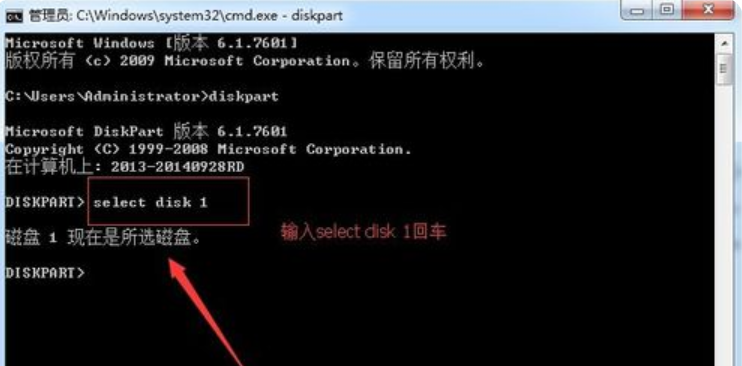 3、再輸入select disk 1命令并回車(注意:寫1就是一個(gè)U盤,兩個(gè)就寫2,以此類推)