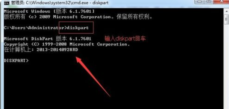 2、接著在打開的命令提示符窗口中,輸入diskpart并回車;