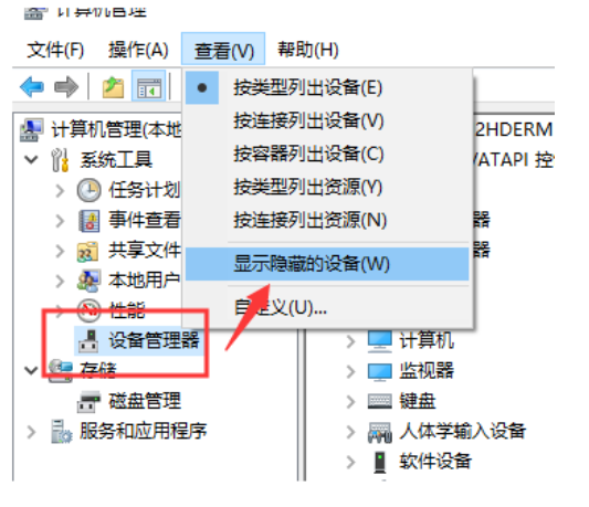 2、點擊左側的設備管理器,然后點擊上方的查看選擇,點擊顯示隱藏的設備。