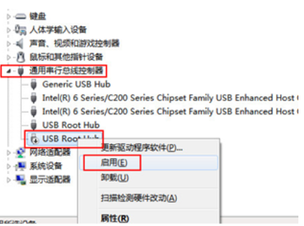 3、下方如果顯示U盤選項,右擊選擇啟用,也可以嘗試更新驅動程序軟件。