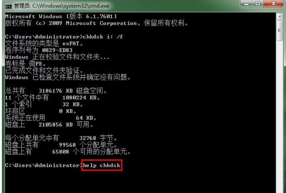 第五步:當(dāng)然chkdsk還有很多其他的功能,如果您想進(jìn)一步的進(jìn)行了解的話輸入help chkdsk就可以了。