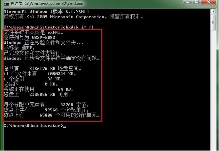 第四步:.輸入命令后,我們按Enter鍵自動執(zhí)行命令。耐心等待u盤修復(fù)完畢就可以了,在chkdsk修復(fù)u盤的結(jié)果中我們可以看到很多相關(guān)信息,包括分區(qū),磁盤大小等。如圖所示: