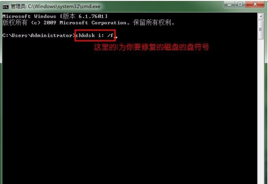 第三步:在界面上輸入chkdsk i: /f 。說明:這里的i就是U盤的驅(qū)動器號,也就是要修復(fù)的u盤驅(qū)動器的符號,例如要修復(fù)的u盤是g盤,那么就用g來代替。背后/f這是磁盤修復(fù)命令,如圖所示:
