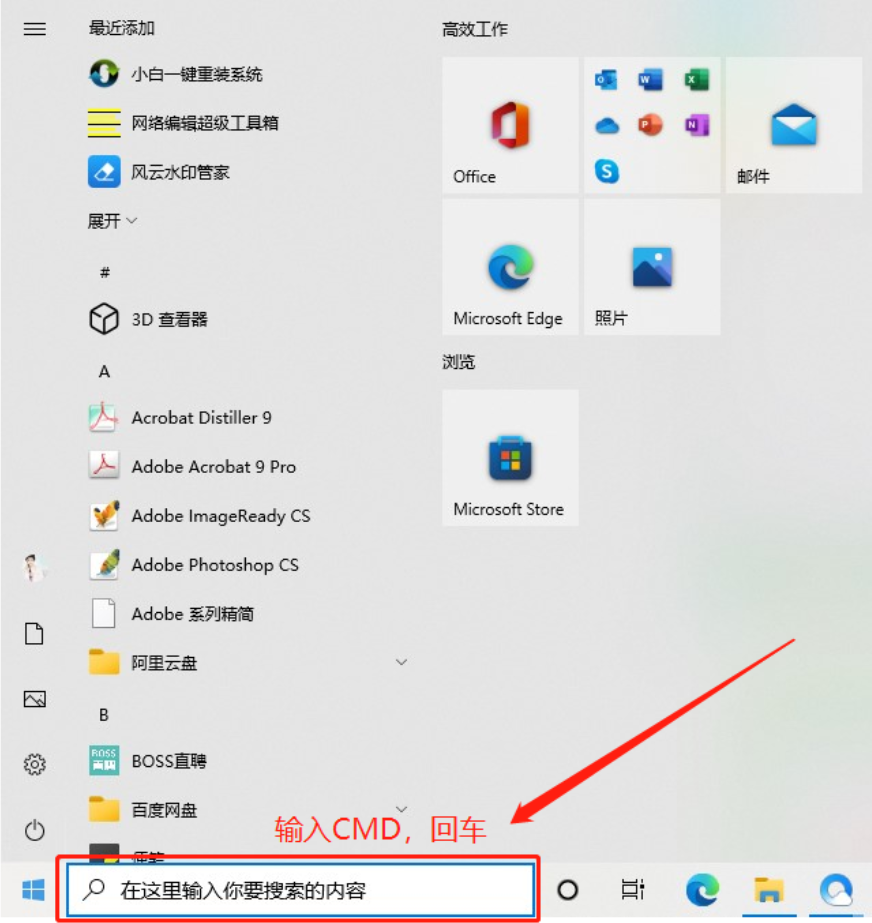 第一步:點(diǎn)擊開始按鈕,然后輸入CMD,回車確認(rèn)。