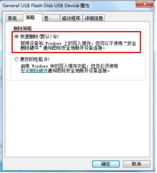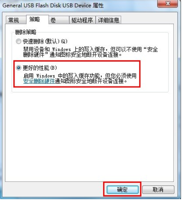 4、將策略改為“更好的性能”(xp系統(tǒng)則是“為提高性能而優(yōu)化”)。這樣就可以解決u盤被寫保護(hù)的問題啦。