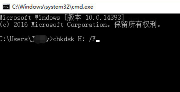 2、輸入“chkdsk H: /F”,其中“H:”是U盤(pán)盤(pán)符,輸入后點(diǎn)擊鍵盤(pán)回車(chē)鍵(用于檢查文件系統(tǒng)情況),提示沒(méi)問(wèn)題的話(huà)直接重新拔插U盤(pán)。