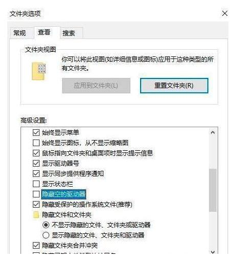 2、進(jìn)入高級(jí)設(shè)置框后,點(diǎn)擊“查看”,取消勾選“隱藏空的驅(qū)動(dòng)器”,最后點(diǎn)擊“應(yīng)用”即可。