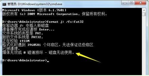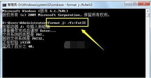 步驟二:如下圖所示,輸入“format j: /fs:fat32”(其中j是U盤盤符,請自行更換),再按回車鍵執(zhí)行U盤格式化。