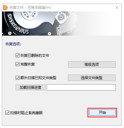 4、在彈出的恢復(fù)文件窗口上點擊"開始"按鈕,隨后進(jìn)入掃描階段。