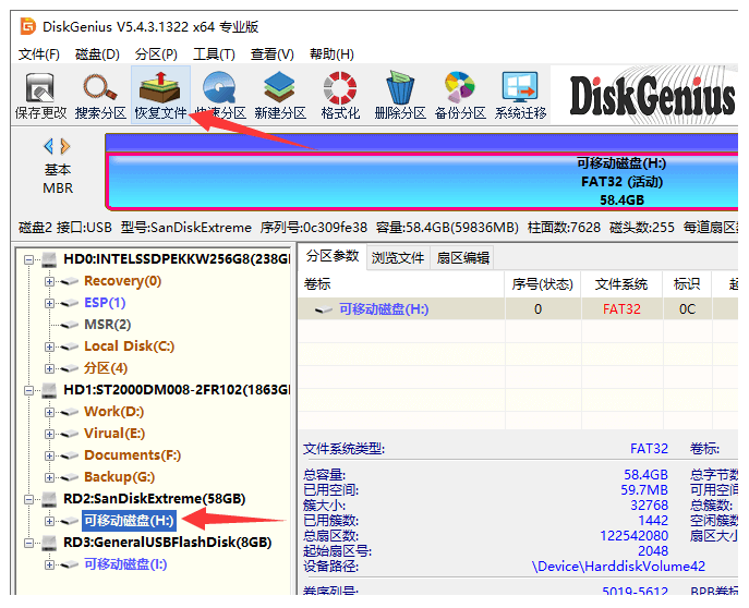 3、在DiskGenius軟件中選中提示格式化的U盤,然后點擊上方的"恢復(fù)文件"按鈕。