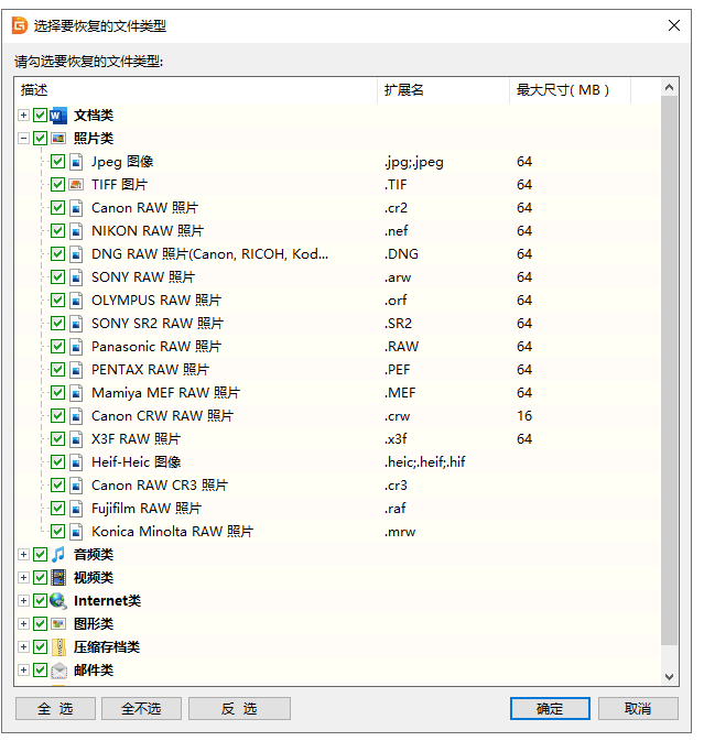 5、若點擊"選擇文件類型"按鈕,會彈出如下窗口。在這里可以指定深度掃描時的文件類型。