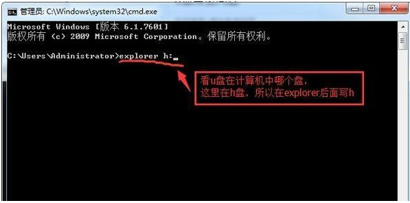 3、 在剛剛打開的管理員命令窗口中輸入“explorer h:”命令(“h”為當(dāng)前u盤盤符),按回車鍵執(zhí)行操作即可。