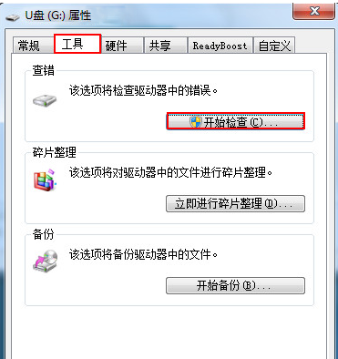 2、然后在U盤屬性窗口中,切換到工具選項(xiàng)卡,單擊查錯(cuò)下的開始檢查;