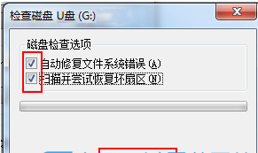 3、檢查磁盤窗口中,我們分別勾選自動(dòng)修復(fù)文件系統(tǒng)錯(cuò)誤以及掃描并嘗試恢復(fù)壞扇區(qū),單擊開始;
