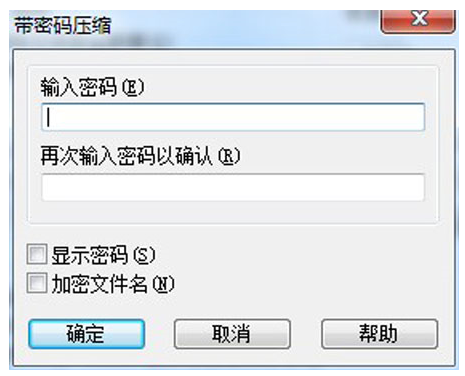 3、隨后會彈出帶密碼壓縮窗口,自行輸入一個安全系數(shù)較高的密碼,輸入完成后點擊“確定”按鈕即可開始對文件進行加密壓縮。