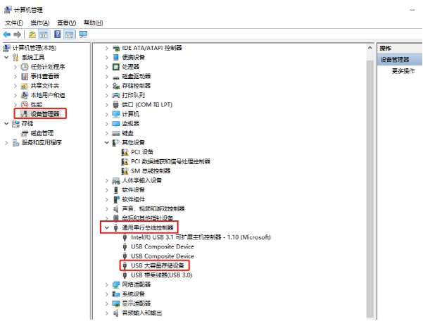 7、 然后就是先進(jìn)入到「計算機(jī)管理」頁面,鼠標(biāo)單擊「設(shè)備管理器」,找到「通用串行總線控制器」,鼠標(biāo)雙擊「USB大容量存儲設(shè)備」即可。
