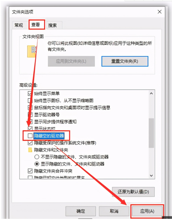 2、此時在文件夾選項界面,單擊「查看」,取消勾選「隱藏空的驅(qū)動器」這個選項,再單擊「應(yīng)用」。