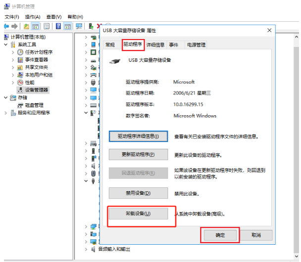 8、 此時我們在彈出的窗口中,單擊「驅(qū)動程序」-「卸載設(shè)備」-「確定」,卸載完成以后,我們再將U盤重新插入電腦,系統(tǒng)會自動加載U盤驅(qū)動,最后檢查一下U盤是否被讀取。